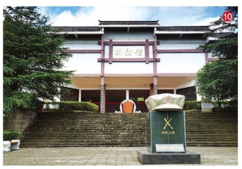 进入景区大门向左侧,台阶上是强渡嘉陵江战役纪念碑(图10),碑上铭刻着这里强渡嘉陵江的日子——1935.3.28,脱下的红军军帽表示对建立功勋的红军指战员们的崇高敬意。碑的后方是功勋馆。功勋馆的正门前立着石碑,上面镌刻的是当年中华苏维埃共和国临时中央政府主席毛泽东对川陕苏区的高度评价。
