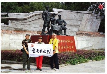 从红四方面军长征出发地纪念馆向右几十米,就到了红四方面军长征出发地纪念碑(图13)。在运筹帷幄的红军指挥员雕像后,是3面巨大的红四方面军军旗。