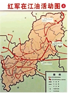 陈列馆突出“红军在江油”的主题,共有3个展室,陈列着红军在江油时的遗物、文献和图片等实物展板,再现了红军在江油的革命活动。从“红军在江油活动图”(图4)可看出,红军活动遍及江油全境。