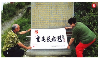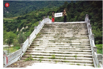 我们在桥上展示队旗(图9),又逐一看了桥身、桥栏、桥柱等处红军留下的石刻标语。