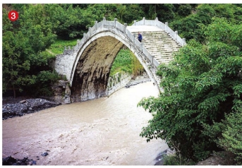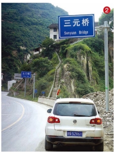 看到“三元桥”“土门镇”两个紧邻着的路标(图2),就到了土门镇了,路的左边就是“红军桥”(福缘桥)。公路通往茂县县城。
