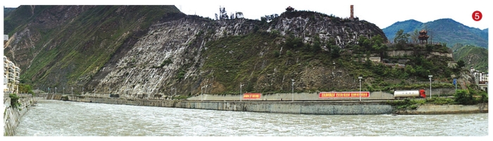 大嫂指着对岸的山崖告诉我们,当年一部分红军要从桥上过岷江,然后翻越江边的山崖,去高处的寨子。她还说,当时红军没有打赢,过不去桥,连长骑着大红马跃入江中,战士们也跟着跳入江中。听罢,我们肃立,一起看着山崖上依稀可辨的小道,再看看滔滔东去的江水(图5)。
