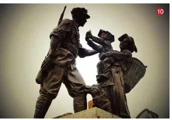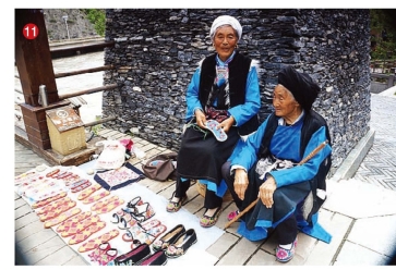 走过桥,另一桥头旁,羌族老妈妈在红军塑像下出售她们手工缝制的鞋垫和布鞋、拖鞋(图11)。