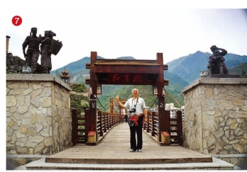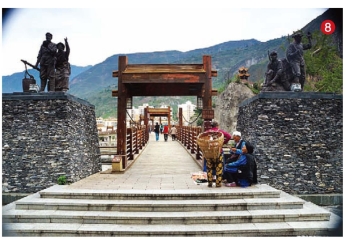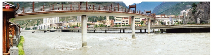 今天我们所见到的“红军桥”(图6)不知是否还在当年竹索桥的位置上,只知道这是“5·12”汶川特大地震后新建成的,两岸是旅游景区。据记载,新中国成立后在县城威州镇原竹篾索桥处先修建了“揉式钢绳吊桥”,后又建成“水泥走廊桥”,“5·12”汶川特大地震后建成了“景区走廊桥”,均以“红军桥”为名。