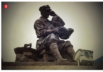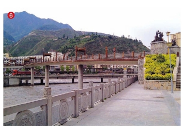 如今,红军桥横跨岷江,桥体呈“T”字形,连接威州镇旧城区、桑坪区和堡子关,全长225.5米,宽3.8米,门楼、栏柱和桥面均为木质结构(采用的是防腐木),两岸的桥头各有两组表现红军在汶川和少数民族群众鱼水情的雕像(图7—图10),而桥上桥下都成为城市景观带。