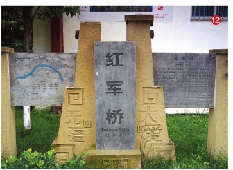 桥头边立着“红军桥”石碑(图12),石碑两侧的阴刻“大爱无疆”透出汶川人民对全国人民支援、重建家园的谢意。