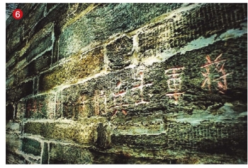 在城门内的条石墙体上,一侧是红军石刻标语“蒋军士兵们,你们拖枪过来参加红军!”(图6),另一侧的石刻标语是“中国共产党万岁”(图7)。