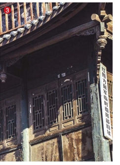 筹边楼是薛城镇里最显眼的建筑(图2),它建在突兀拔起的天然巨石顶上,距今已有上千年的历史。这座楼是唐代剑南道西川节度使李德裕为筹划川西防务所建,当时唐、蕃对峙,他率领将士在此戍边,筹划边关事务,因而得名“筹边楼”。该楼为正方形二层重檐歇山式木结构建筑,通高18米,有石阶盘旋而上;底楼为正方形,边长7.38米,高4.43米,以外柱12根、内柱4根将其空间隔成进深、面阔各3间;内外柱为方形,四棱卷起弧线,方形须弥座石质柱础。楼外建石栏杆一周,石栏杆、桩、条栏均为方形,柱顶为须弥座上托莲花瓣石珠。二楼高3.6米,中为方形大厅,边长3.64米,四周板壁及顶部望板皆彩绘各种人物故事图案,内容多为李德裕筹边故事,如商讨军事、演练兵士、山川地形等。筹边楼本来不在此巨石上,而在河对面,清康熙四十七年(1708),楼被大水淹没,后来迁移至此处。筹边楼曾经作为红四方面军的总指挥部,徐向前等领导人在此指挥了维关、娘子坡、宝殿寺、梓潼宫等战斗。在楼台的一角挂着“红四方面军临时指挥部旧址”的牌子(图3)。