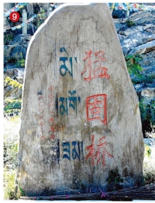 在公路对面还有一个更大一些的“猛固桥”石碑(图9),碑的背面镌刻着《猛固桥简介》(图10):猛固桥始建于清代,原身为木桥,1932年民众集资建成铁索桥,该桥与白塔、马鞍桥形成“猛固三景”。猛固桥扼小金去都江堰、马尔康之交通要道,地势险要,易守难攻,历来就是兵家必争之地。1935年红军长征在这里与国民党守军进行了激烈的战斗。6月16日,红四方面军三十军政委李先念在这里率部迎接毛泽东、周恩来、朱德、张闻天等中央领导人进入懋功县城。(注:此碑文时间有误,中央领导人进入懋功县城的时间应为6月18日。)
