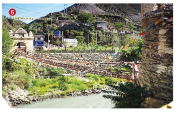 这个地处要冲的路口位于小金县老营乡地界,从东向西奔腾的沃日河与从西北往东南流淌的金川河(抚边河)在此交汇(图5)。路口南侧横跨沃日河的铁索桥是猛固桥。登上路口对面的白塔(吉祥塔)就可以看见横跨金川河的铁索桥马鞍桥。这两座桥在清代为木桥,1932年时由民众募捐集资建成铁索桥。两座桥梁风格相似,均以粗铁链为底索并排承载桥面木板,两边各拉两根铁链为护索,桥两端都建有桥头堡。