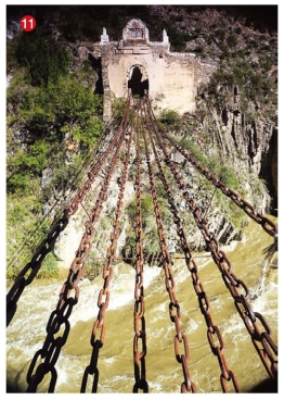 登上白塔旁的小道阶梯,就看见了横跨金川河的马鞍桥(图11),类似猛固桥,桥长30米,宽1.65米,也是6根底索。对岸桥头堡拱形门洞上匾刻“伏龙”二字。