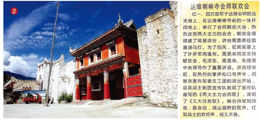 当天晚上,按照总政治部的安排,两个方面军共同召开庆祝会师联欢晚会。达维镇上,只有喇嘛寺前有一块平坦一些的空场,会师庆祝大会就在这里举行。如今,那座喇嘛寺(图2,是一个苯教寺庙)是1938年重建的(新中国成立后又经过了翻建),因为红军走后,尾追的国民党军队焚烧了寺庙。但老乡们说,寺庙旁边有一堵老墙是原来的,石墙前的土堆就是庆祝大会讲话的地方。