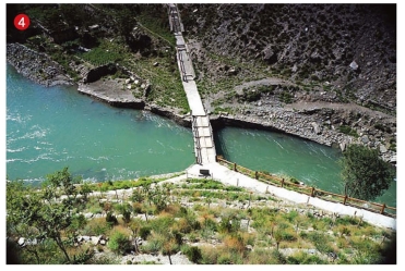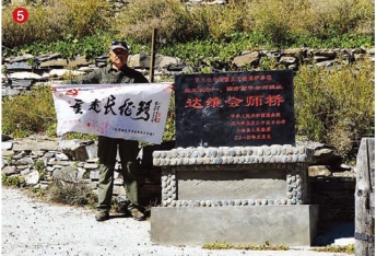 这座木桥始建于民国初年,木制的桥长13.6米、宽2.8米,伸臂式结构,桥面有木制扶栏。不过,当地的藏族小朋友说,现在的这座桥并不是真正的红军会师桥,真正的会师桥原在上游10余米处,修夹金山公路时被河水冲垮,现在的桥是易地后仿建的。这个说法有根据,因为在网上看到的早一些的木桥照片中,和现在的木桥确有不同。从图4中也看出,木桥的左侧不远处就有老桥桥头的遗迹。