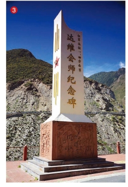 我们穿过达维镇,就看见了公路边上竖立着赭红色底座、白色棱柱形的纪念碑(图3),碑体为四棱立柱式,上书“红军长征一、四方面军达维会师纪念碑”,碑座的4面分别是表现红军强渡大渡河、翻越夹金山、胜利会师内容的浮雕和小金县人民政府的《碑志》。这个纪念碑是2002年由小金县人民政府修建的,大理石碑高10米。