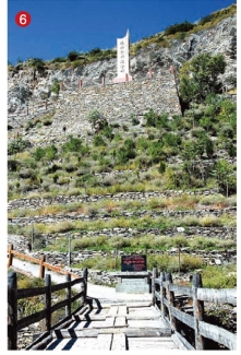 达维会师纪念碑位置是在山半坡一个不大的平台上,从平台上俯视即可看见翠绿的沃日河与跨河的小木桥。小木桥和解放后修建的旅游栈道相连,栈道从桥头一直向上延伸、盘旋,直至成为翻越夹金山的小道(图4)。