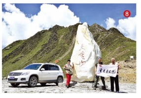 到达山顶垭口处,有停车场。挺立在小广场中标志性的白色石碑刻有“夹金山”3个大字,标明“海拔4114m”。石碑的背面的文字是“熊猫家园传奇宝兴欢迎您”。看来这垭口是小金县和宝兴县的分界线啦。天气晴好,虽然气温只有8℃,感觉不出“寒冷”。大家高兴地展开队旗合影(图8)。