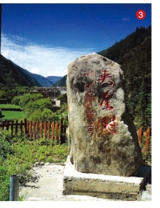 上山不久,就见路边立有一大石,赫然刻着“夹金村”三个大红字(图3),大红字左边还有藏文。这就是有着“红军翻越雪山第一村”之美誉的夹金村的村口。再南下过夹金村就出了阿坝藏族羌族自治州境了。