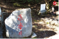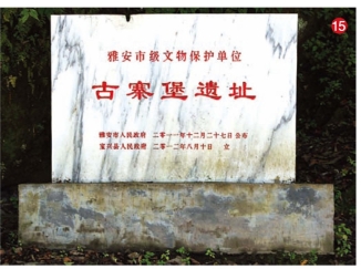 网上有资料说,在凉水井拐弯处的山上有一个残破的石头碉楼,当年红军经过这里时,一些土匪就在碉楼里放冷枪袭击红军,但很快就被红军攻下来了。我们举目四望,辨不清碉楼在哪里。但是路边有雅安市、宝兴县竖立的“古寨堡遗址”石碑(图15),说明这里和古寨、碉楼确有关系。