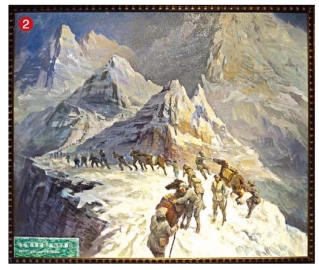 油画《拽着骡子尾巴上雪山》,就是我们父亲田长华翻越雪山的真实写照(图2)。