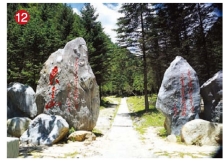 在“红军长征夹金山纪念地”石碑的后面,就是红军翻越夹金山的小路起点。小路路面经过了铺装,通向林间,往山上而去。在附近是夹金山林业局蚂蝗沟工程区,也是夹金山旅游接待站,看来这里是蚂蝗沟。小路旁左侧竖立着石碑,上刻“中国工农红军长征翻越的第一座大雪山夹金山”几个红字。右侧一块大石上,刻着毛泽东的诗句:“更喜岷山千里雪,三军过后尽开颜。”(图12)前面我们已经分析了,夹金山应是中央红军翻越的第一座大雪山,中国工农红军最先翻越雪山的是红四方面军。