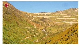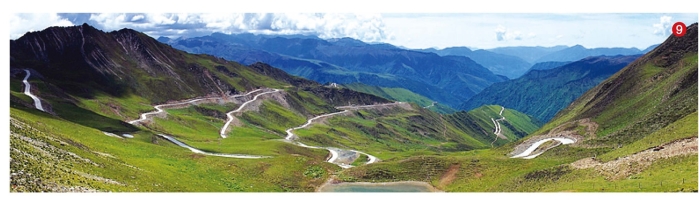 从夹金山垭口就开始下山了,俯瞰盘旋弯曲的盘山道(图9)。时值6月,远处山峰还有一些残雪。