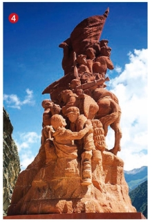 经过村口,来到夹金村的小广场,在这寸土寸金的地方,夹金村人不惜平整出一块空地,竖立了一座高大的赭红色的雕像(雕像没有标注名称),表现藏民送别红军、红军奋力攀登的情景(图4)。