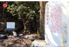 我们继续下山,到了扎角坝红军井(图13),当地人也称为凉水井。村民还在此洗漱。当地人称“坝”,就是有平地。凉水井是岩石缝中的山水流到地上的一个溶洞里,形成的一个天然的水井,路旁有“凉水井”石碑(图14),一块简介碑介绍:该井原名“凉水井”,1935年6月红军长征经过这里时,曾在这里扎营露宿、饮马休息。红军走后,当地百姓为缅怀红军,称这口井为“红军井”。