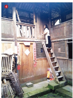 看完铭牌上的说明,我们更加迫切希望看到诗作的真迹。这位妇女见状,顾不上吃饭,拿出钥匙要带我们上堂屋对面的二楼。这时,我们才看出来她的腿有些残疾。但她谢绝我们自己开锁上楼的请求,执意缓慢地爬上陡峭的木梯,开锁开门(图4),还抱歉地提醒我们,老屋子楼板不结实,让我们一个一个地上去。