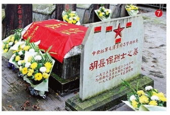 胡长保烈士墓前有鲜花,墓碑上贴着带有“中国人民解放军”字样的贴标,战友们没有忘记这位舍生忘死保护领袖的忠诚卫士!我们也为烈士做点什么,擦拭墓碑,恭敬地为烈士捧上一束花,覆盖上我们的重走长征路队旗(图7)。