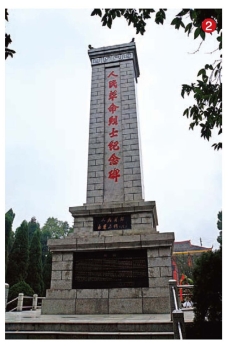 进入大门,看到“荥经县烈士陵园”石碑,石碑旁是上山的台阶路。沿台阶向上,平台上是人民革命烈士纪念碑(图2)。