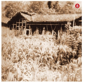 当地人还说,毛泽东在化林坪住过3天的房子还在。几年前,有徒步长征路的人去看了这座房子,房子被四周茂密的树枝和墙内红色的月季遮挡,院门上了一把生锈的铁锁,似无人居住了。隐约能看到黑色的大门上一副保留了多年的红色对联,但字迹已辨认不出。我们看到了三合乡毛泽东黍子地长征旧居的一幅老照片(图8),也许不久的将来,修复的旧居会向人们展示。