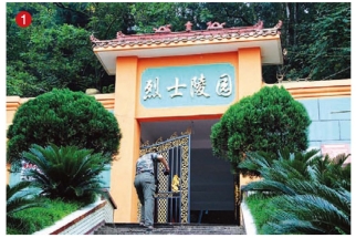 我们终于打听到了烈士陵园的位置,要抬头看,透过路边的树木,才发现了路边高坡上的烈士陵园彩色大门(图1)。