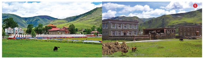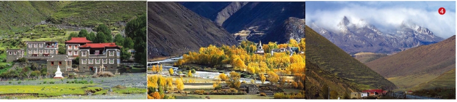 新都桥又是G318国道和S215省道的交叉路口,我们由此转向北走S215省道往八美镇,三级柏油路面。沿途陆续经过湿地、农场、“绿水红花景区”、延绵不断的彩色经石“阵”(河滩上)、山坡上的经幡阵……康巴藏区漂亮的藏民居和成群牛羊散落在路两边的草原上,与公路依依相随的小河更是一道流动的风景线。这里一年四季都是摄影的佳地(图5),照片比语言更能说明情况。