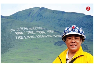 在垭口眺望康定方向,是蜿蜒曲折的盘山公路;眺望新都桥方向,则是地势较为平缓、略有起伏的高山草原。巨大的藏、汉、英3种文字的“康定情歌”铺在山坡上,即使是海拔4298米的地方,也挡不住人们留影的热情。《康定情歌》那可是联合国教科文组织向全世界推荐的10首民歌中唯一的一首中国歌曲。我们中的姐姐田晓虹特意戴上缀有红五星的帽子留影(图2)。