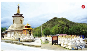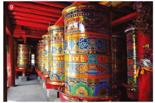 如今,宁静的小镇,路右边是有名的塔林(图8),路左边是号称世界最大的“吉祥转经筒”(图9),不时有人在转塔、转经筒。
