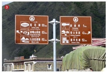 在瓦泽乡,路标指示出前行去往新都桥、塔公草原、道孚民居(图3)。