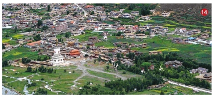 如今的道孚城已经不是“形如马”,城区不断扩大,漫坡的鳞次栉比的藏式民居,它们从平坝向着低缓的山坡上蔓延,构成道孚最知名的人文风景线(图14)。