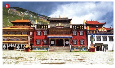 到了塔公寺(图6),也是塔公镇。“塔公”藏语意为“菩萨喜欢的地方”。塔公寺是藏传佛教萨迦派(花教)著名寺庙之一,有“小大昭寺”之称,是康巴地区藏民朝拜的圣地之一。塔公寺金碧辉煌,与周边广袤的塔公草原、远处雅拉神山相衬,绿地、雪山,还有蓝天白云,构成了一幅秀丽的高原风光。塔公寺处于美丽的塔公草原之中,石碑上标示“塔公草原海拔高度3750米”。