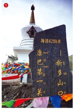 从康定县城一路向西,途中通过折多山口。这是G318国道(川藏南线)上第一座海拔4000米以上的山口,在G318国道的2879km路碑(K2879km)处。山口上的黑色石碑是新立的(2012年时还没有),金字标明“折多山口——康巴第一关海拔4298米”(图1)。路过的游人都会在此留影。