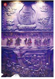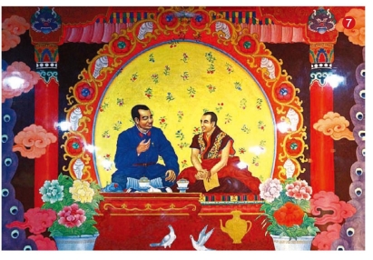 有一幅唐卡(图7)表现了朱德总司令和炉霍觉日寺的扎日活佛亲切交谈的情景。1936年3月29日,炉霍觉日寺的扎日活佛亲自骑马迎接朱德,并写信禀告甘孜寺、大金寺不要对抗红军,对后来红军顺利进驻甘孜县起到了积极作用。