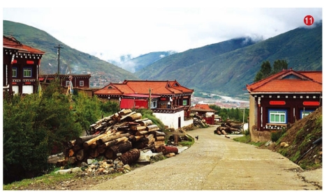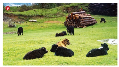 如今村子里的新房子比比皆是,粗大的原木堆放在路边,还要盖新房。问起盖房子得多少钱,藏民们有些不好意思地推脱不说,后来却争相说起来:有的家花了50万,有的家花了80万,最多的一家花了300万!怪不得看他们一脸幸福的笑!连牦牛们都那么安逸(图9)!