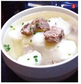 炉霍至今还有一道红军特色菜——“棒打萝卜”。当年4万红军吃饭是个大问题。由于萝卜在炉霍一带生长较好,个头又大,就成为常吃的蔬菜。由于部队人数多,厨房的菜刀不够用,切萝卜工作量太大。为了省力气,人们就用木棒将萝卜打碎,然后用清水煮。久而久之,用木棒打碎萝卜的做法就流传开来。如今虽然也是“棒打萝卜”,但已经不是清水煮出来的,而是用鲜美的排骨、棒骨炖菜了(图3)。