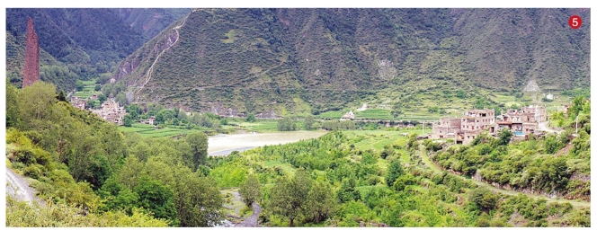 脚木足,嘉绒藏语的发音应为“脚木脚”,嘉绒藏语“脚”是山谷的意思,“脚木足”的藏语意为“山谷里的河坝”,这里地处脚木足河即大渡河上游河谷,地势平坦,土地肥沃,是马尔康的粮仓。脚木足曾被音译作“卓木碉”(“卓”与“脚”的发音近似)。也有说是因为白莎村有两个雄伟的碉楼,所以白莎村也被称为“卓木碉”。我们清楚地看到白莎村(“卓木碉”)地处脚木足河谷(图5)。