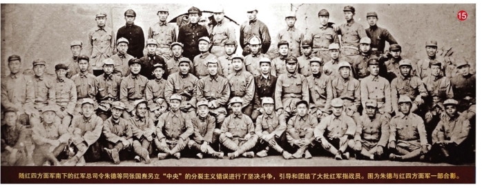 有一幅照片(图15)表明了朱德总司令在红四方面军中的地位——随红四方面军南下的红军总司令朱德等同张国焘另立“中央”的分裂主义进行了坚决的斗争,引导和团结了大批红军指战员。图为朱德与红四方面军一部合影。