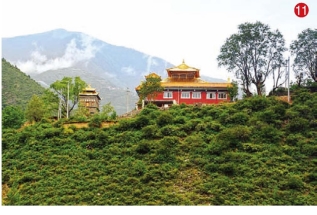 走到村边可以看见脚木足河边的高坡上有一座金顶寺庙,就是白莎寺(白赊寺)(图11),当然,这是重建的,并且已不在原址上了。