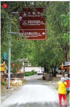 离开金川县城,我们去脚木足乡,是要去看看张国焘成立“第二中央”的地方。来金川的时候在路上没有发现去往脚木足乡的路口,现在往回走,格外仔细观察路口,幸好还是及时发现了它。在这个路口转弯后就是乡道,路况很差,天下着雨,还有大货车占道,走得小心翼翼。走到一个村头,总算看见了一旅游标牌——“卓木碉会议旧址2km”(图1),右转。