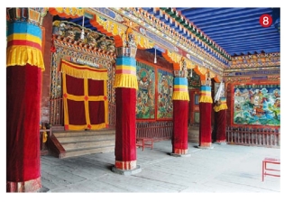 红军到达这里时,大部分喇嘛都逃走了,寺院很空,因此住了很多部队,楼下楼上都住得满满的,解决了红军住宿难的问题。寺院现在还保留了少量标语。当年的中央政治局扩大会议就是在寺院的一个偏殿里召开的。索花寺还有一个新修缮了的偏殿(图8),不知是否为当年会议地点。