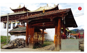 索花寺左侧有亭楼式的院子大门(图7)。看到大门,才知道我们是从侧门进来的。大门旁立有“毛儿盖会议会址”石碑。