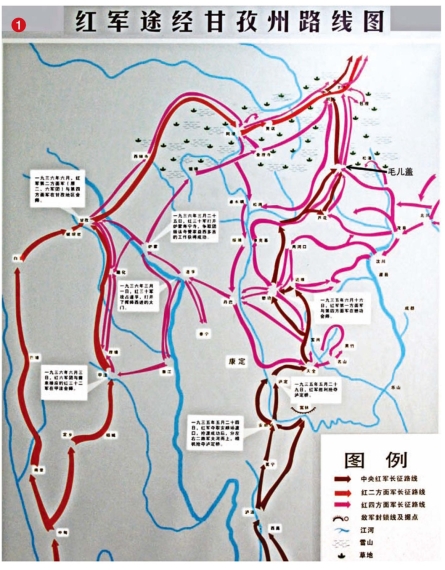 毛儿盖在长征路上的什么位置?看路线图(图1)中靠近右上角,毛儿盖就在草地的南侧边缘啦!是中央红军和红四方面军共同北上时,右路军进入草地的出发地——松潘在毛儿盖的东北方向,由于松潘被国民党军胡宗南部占据,右路军只能从毛儿盖进入草地北上,去往班佑、巴西。而当红四方面军未继续北上、返身南下时,右路军中的红四方面军部队(包括我们的父亲)再次回到毛儿盖。当红二、四方面军共同北上时,没有再走毛儿盖,而是从阿坝方向穿过草地。因此,红军“三过草地”中两次与毛儿盖有关。红军行军路线密集于毛儿盖。