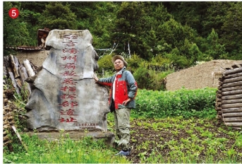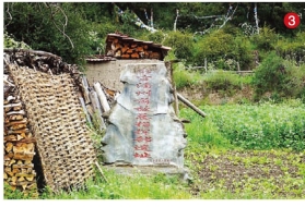 1935年9月3日,在包座战役大胜无虞后,右路军前敌总指挥部(徐向前率领)从巴西班佑寺搬来潘州寨,驻地在此。如今,古城里当年红军右路军前敌指挥部驻扎的房子也已荡然无存,求吉潘州前敌总指挥部遗址就在现任村长家后院的一片小菜园子里(图3),地里土豆长势旺盛,菜园子旁还码着一堆劈柴。庆幸的是县政府在这处遗址旁立下了纪念碑。